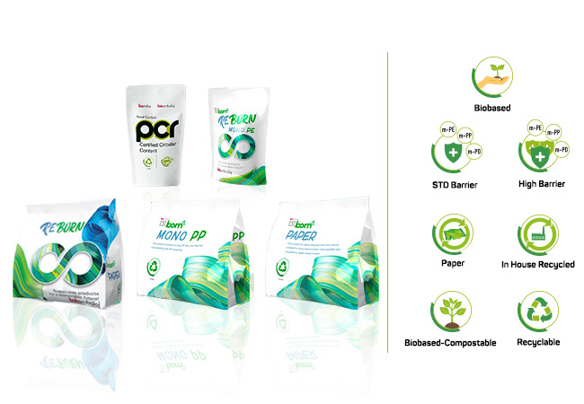 Reborn Ürün Ailesi’nin Ambalajları, AR-GE çalışmaları sonucu geliştirilen, uzun raf ömrü için yüksek bariyer özelliğine sahip %100 geri dönüştürülebilir ambalajlardır.